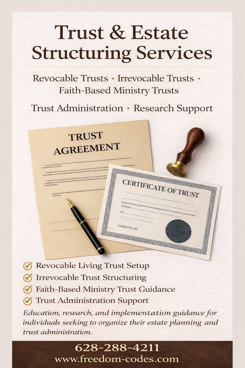 Take control of how your assets are managed, protected, and passed to your family through a professionally structured Revocable Living Trust.